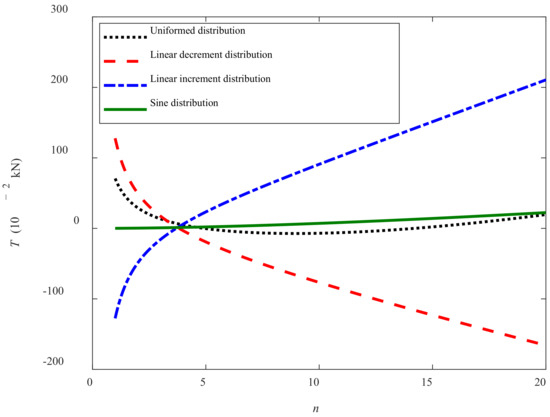 Figure 13 shows the relationships between traction force T and time t of the track shoes (n = 10). It can be seen that at the beginning of moving (i.e., t = 0 s), the instant traction forces are positive under uniformed distribution and linear decrement distribution conditions, but negative under linear increment distribution conditions. After the tracked miner moves (i.e., t > 0 s), the traction force changes greatly with different trends. It illustrates that the traction force is greatly influenced by the time. Moreover, during the period between 0 and 4 s, the traction forces decrease with time under uniformed distribution and linear decrement distribution conditions, but basically keep constant under sine distribution and increase with time under linear increment distribution. All the traction forces arrive at zero at about t = 4 s. It can be seen that when t > 4 s, the Tincrement > Tsine > Tuniformed > Tdecrement during the same period. This is because the track shoes near the front of the crawler head are subject to the largest magnitude of the grounding pressure under the linear increment distribution condition, which leads to c(t) getting the largest in a short time and helps increase the Tincrement. For the sine distribution condition, the traction force under the different periodic grounding pressure is basically eliminated, but the sum of the traction force is not zero because of the effect of time on different track shoes with different locations. Under the uniformed and linear decrement distribution conditions, the Tuniformed and Tdecrement are always negative between and 4 s and 10 s and signify that the Tuniformed and Tdecrement becomes the resistance for the moving tracker miner, which is due to the smaller effect of temporal summation on the time-dependent parameter of the shear strength.
