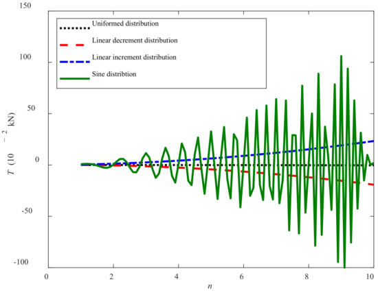 Moreover, under the same number of track shoe n and during the same period of time t, the absolute value relationships of T are Tsine > Tincrement > Tdecrement > Tuniform. For the sine condition, the curve of T is close to sine and gradually increases, but with an abrupt decrease as the number of track shoe becomes 10. This is because the increasing n in the traction force model may narrow the sine characteristics based on the fact that the maximum value of sine is one.