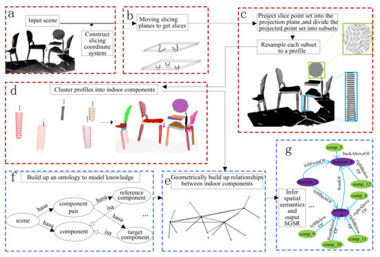 The framework of the proposed method: (a) Input an indoor scene model; (b) Slicing the indoor scene model; (c) Generate the profiles; (d) Cluster profiles into different indoor scene components; (e) Construct the relationship graph; (f) Build up an ontology to model knowledge about indoor scene components; (g) Infer spatial semantics and output SGSR of the input scene model.