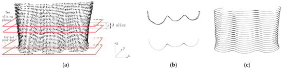 Slicing and resampling of point clouds: (a) Slicing of point clouds; (b) A slice and a profile; (c) Profiles of the point clouds.