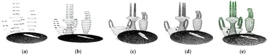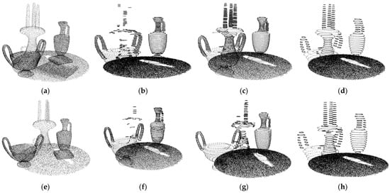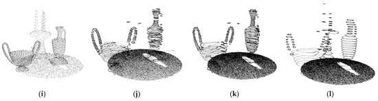 To obtain the appropriate value of the density factor , we performed experiments on indoor scene models with different densities. By using different sampling rates to down-sample the indoor point cloud, point clouds with different densities can be obtained. Given a tabletop scene model (Figure 3a), we chose the original model, the 50% down-sampling model, and the 25% down-sampling model for the experiments. We set to 0.14, 0.23, and 0.34 for the models. The results are shown in Figure 3b–l). If is smaller, the slice will be thinner. The thinner the slice, the fewer points on the slice. In a severe case, profiles will fail to be obtained. As can be seen, the profiles are largely missing when is 0.14 or 0.23. When is 0.34, good results are achieved. In our work, was set to 0.34.