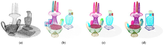 To demonstrate the advantage of the proposed method, we compared our method with RANSAC [16], a local convexity-based method (LCB) [31], a CRF-based method [27] and PointNet++ [28] on the tabletop scene and the meeting room. The results are shown in Figure 15. It can be seen that the complex-shaped indoor scene components such as the bowl handle and some chairs and legs were not detected exactly by LCB and RANSAC. With the help of machine-learning technology, CRF achieved better results than LCB and RANSAC. However, CRF still failed to detect some components due to the fact that the optimal CRF model parameters are difficult to obtain. The semantic segmentation results of PointNet++ are shown in Figure 15d, where the components semantic categories are labeled. The indoor scene components with same semantic categories are further separated by a classification network and the instance components are shown in Figure 15e. A few of the components were not detected accurately by PointNet++ because of the wrong semantic label of points.