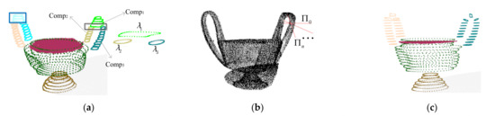 Note that some complex-shaped components may be over-segmented due to the profiles in some local surfaces of the components (see the blue rectangle in Figure 6a). To solve the problem, we will locally adjust the slicing direction in a way similar to the method in [45] at this local surface. Specifically, given three components, Comp1, Comp2, Comp3, if a profile of Comp1 is respectively overlapped with its neighbor’s profiles that belong to Comp2 and Comp3 (see Figure 6a), we label the component set as , and we reslice the raw points that correspond with Comp1. A rotational slicing direction will iteratively be applied in the raw points (see Figure 6b) until the optimal slicing is found. Then we re-cluster the re-generated profiles and the profiles of Comp2 and profiles of Comp3, and update the clustering results (see Figure 6c) according to the minimum number of components principle.