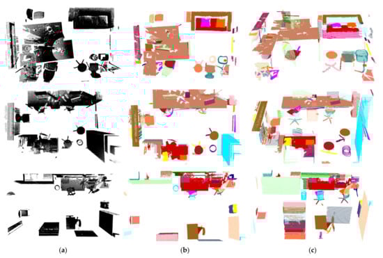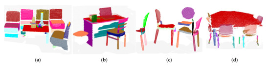 Most of the approaches [6,7,8,9,10,11,12] for the detection of indoor scene components concentrate on using primitive shapes (e.g., planes, cylinders, spheres, cuboids, etc.) to approximate the components and exploit 3D primitive shape segmentation algorithms such as Hough transforming [13,14] and Random Sample Consensus (RANSAC) [15,16] to detect indoor scene components. In these approaches, the primitive shape features of indoor components are always pre-assumed, which is not suitable for complex-shaped indoor scene components.