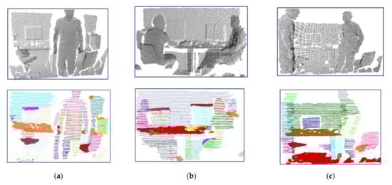 TUM dataset is a low-quality RGBD dataset and its scenes include persons. Generally speaking, persons have more complex shapes than furniture. Through the TUM dataset, the effectiveness of the proposed method for complex shaped indoor components was evaluated. Figure 13a–c respectively shows the detected indoor scene components of three kinds of scenes that including person with different poses. It can be seen that the walls, computer screens, table tops, most body parts of persons have been detected effectively. Moreover, the TUM dataset is made up of low-quality RGBD data, which increased the difficulty of detection of components. Due to the adoption of profile features instead of point features, the general object and human separation of our method was still very good. The executing time of our method on the three datasets are shown in Table 3.