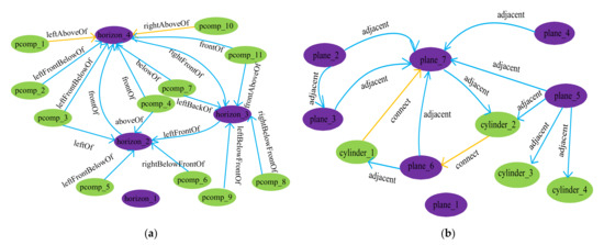 On the other hand, some approaches [41,42,43,44] have been proposed to extract spatial relationships from indoor point clouds based on prior spatial knowledge. For example, Zender et al. [42] presented an ontology to encode the spatial and functional knowledge of typical indoor environments. Suchan and Bhatt [43] adopted prior knowledge to extract commonsense spatio-temporal relations. Most existing knowledge-based methods have aimed to provide root navigation for indoor robots or model specific interactions between human and indoor objects. They mainly focused on the inter-object or human-centric spatial relationships. As a smaller-grained element of scenes, spatial relationships between the indoor scene components are also affected by the structure of indoor objects. Accordingly, it is more difficult to detect the spatial relationships between indoor components.