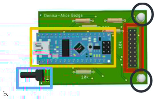 For the implementation of the printed circuit board, we used Eagle (Figure 3a). For visualization as close as possible to reality, we exported the 3D model in Fusion 360 (Figure 3b).