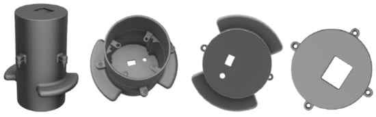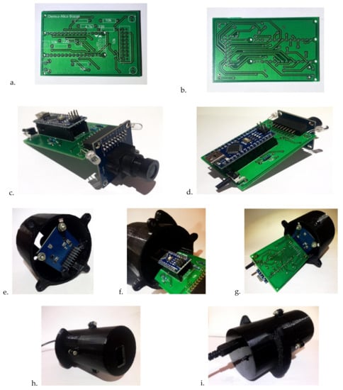 The housing consists of two cylinders connected through the four screw types M3 × 14 mm. The height of the first cylinder (top) is 47.5 mm calculated according to the focusing distance of 25 mm, and the length of the camera lens of 20 mm is added to its 2.5 mm grip. The height of the second cylinder is 67.4 mm, this value being a sum of the populated PCB’s length and the length of the connectors that hold the OV7670 camera (Figure 5c,d). The bottom of the last cylinder has two cuts that facilitate access to the USB B of the Arduino Nano board for connection to the PC and the pressing of the push button that starts to capture the images. The top of the first cylinder has a lid with a cut of 20 × 15 mm because this is the image’s physical size that the camera can capture at a distance of 25 mm for focus. Thus, we ensured that wherever the mole is positioned within this cut will be captured by the camera.