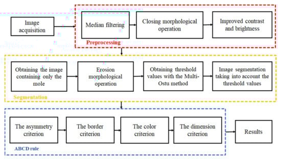 Image processing is a domain that is evolving rapidly. Its applications are met everywhere: medicine, the army, industry, art, or where information from the environment is represented in the form of images. For mole evaluation, image processing brings a strong advantage, helping doctors to numerically quantify the mole shape and the presence of colors in it—values that are very important in making a decision regarding a possibly cancerous case. In the state of the art, there are many papers dealing with this problem, some using the classical procedure of image shape analysis [,,], and some implementing ML (Machine Learning) and DL (Deep Learning) methods [,,]. Still, the ABCD rules are best as preferred and optimal methods for feature extraction, as can be seen from such recent works as [,,,,], some of these combining the ABCD rule with other feature extraction techniques and applying ML for classification [,].