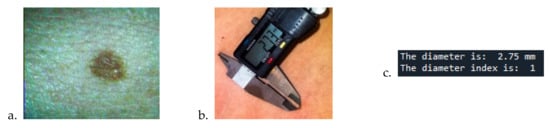 Mole diameter analysis for an image: (a) captured by the camera, (b) measured by vernier, (c) by calculating the diameter index.