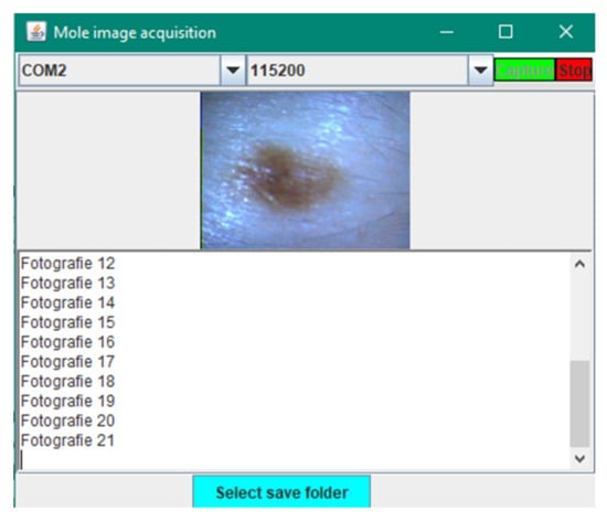 Once the first executable is launched, a window will open that will permit choice of the port on which the connection is made, selection of the Baud Rate and the start of capturing the image, as shown in Figure 9.