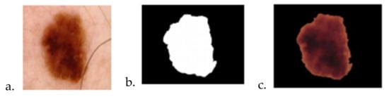 To validate our system for segmentation and computing of ABC parameters, we used the PH2 dataset [], which contains 200 moles, including 40 melanomas, 80 common moles, and 80 atypical moles. The validation was carried out just for the segmentation step, and some of ABCD rule scores are freely available online. The diameter score was not validated because we did not correlate the pixels and mm values for the PH2 dataset images.