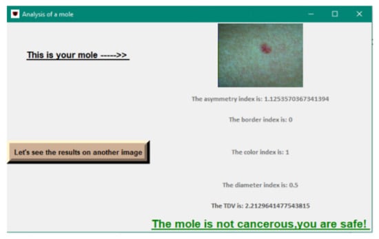 The first step is image acquisition, and this is done by using the developed device. The images are uploaded for software processing, through an interface realized in Python programing language using the standard GUI (Tk GUI), OpenCv packages. Some improvements are applied to the images. The second step, preprocessing, involves correcting the image in terms of noise, brightness, and contrast to get the most eloquent results at the segmentation step. Changing the contrast is done with the help of point operations that are associations (mapping) that link the original gray level to its new value []. The enhancement of brightness and contrast was achieved with a grayscale clipping function (by a piecewise linear transformation). The median filter and the closing morphological operation were applied on the images to completely remove the noise and the hairs that may appear near the mole. Mathematical morphology takes a form-oriented approach to image processing. Appropriately used, mathematical morphology leads to processing that simplifies the structure of the image, preserving the essential characteristics of form and eliminating irrelevances.