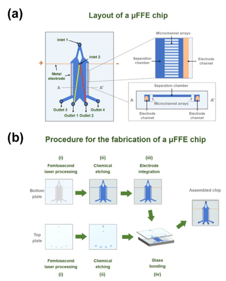 To date, some representative methods to prepare μFFE chips have been developed [7,8,9,10,11,12,13,14,15,16,17,18,19,20,21]. For polymeric materials such as PDMS and ABS plastics, soft-lithography [8] or three-dimensional (3D) printing [9] are popularly adopted due to their economy and ease of operation. However, for some specific applications, such as the separation of organic molecules and toxic substances, the use of glass materials such as fused silica is more desirable regarding the superior chemical inertness, wide transmission window, and mechanical strengths of glass. For fabrication of glass-based μFFE chips, usually, a combination of the lithographic method and subsequent bonding is widely used [10,11,12,13,14]. To ensure the long-term and stable operation of μFFE, the electrolytic bubbles generated around the electrodes need to be timely expelled. Otherwise, those bubbles could severely affect the stability of the separation performance. Therefore, rational design of chip configurations, including controllable isolation of micro-separation units and integrated electrodes, is of vital importance. Although direct integration of the electrodes to the sides of a separation unit without isolation can apply for the μFFE chip, the performance of the chip is inherently limited in terms of its low separation resolution and low throughput. To address the bubble issues, several protocols such as physical isolation using geometrical structures [10,14], integration of membranes [11,15,16], and gels as salt bridges [17] have been adopted in many μFFE devices. However, the manufacture of high-throughput and highly stable μFFE glass chips in a simple fashion remains a challenge in terms of tedious and complex fabrication procedures.