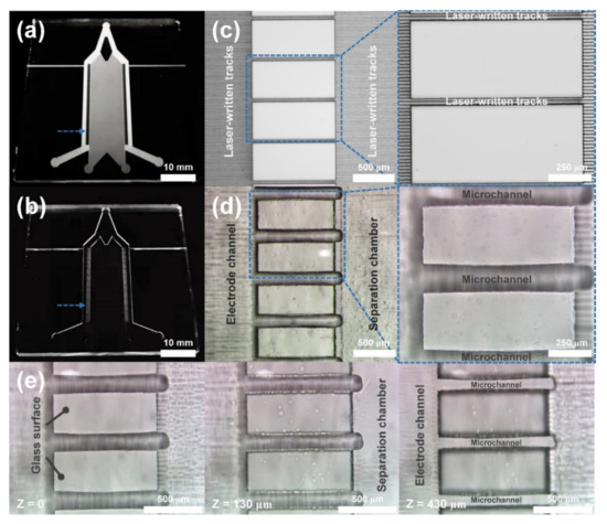 To assemble a μFFE chip with desirable size, high-precision and high-quality fabrication of the bottom plate of the chip is of vital importance through fs laser-assisted chemical etching since the top plate of the chip was only composed of several vertical ports. Figure 2a,b show photos of fs-laser-processed fused silica samples before and after chemical etching, respectively. One can see that the laser-modified areas (see gray parts in Figure 2a) can be fully removed to form a bottom plate with open microfluidic structures (see Figure 1b and Figure 2b) after chemical etching. Figure 2c,d show optical microscope images of the laser-processed microstructures indicated by dashed arrows in Figure 2a,b, respectively. Laser written tracks after 5% HF ultrasonic etching for 15 h were removed to form open microfluidic structures, including an electrode channel, a separation chamber, and several parallel microchannels. Especially, as shown in the insets of Figure 2c,d, the microchannels with widths of ~150 μm and depths of ~430 μm were obtained through the chemical etching of laser-written tracks with widths of ~40 μm and depths of ~450 μm. The decrease of the depths, as well as the increase of the widths, may be ascribed to the spatially isotropic etching of the pristine fused silica in 15 h HF etching besides the removal of the laser-written tracks [22,24]. With the spatial control of the fs laser direct writing scheme and subsequent chemical etching, open microfluidic structures with different heights can be easily fabricated to form different parts of the bottom plate of the chip. Figure 2e show optical microscope images of the etched microstructures at different focal positions. The height of the separation chamber and the electrode channel were ~130 μm and ~430 μm (as same as the microchannel array, see the right panel of Figure 2e), respectively. In principle, the geometrical shapes and sizes of the open microfluidic structures can be controlled by tuning the processing parameters of fs laser direct writing (e.g., pulse energy, writing speed, line-by-line spacing, layer-by-layer spacing, etc.) and the subsequent chemical etching process (e.g., etching time, etc.) [22,23,24,25,26]. Herein, a height ratio of ~1:3.3 between the separation chamber and the electrode channel was optimized to enhance the exhaust of bubbles and maintain the stability of the separation processes. When the height ratios were set at 1:2 and 1:4.3, both manufactured chips could not experimentally obtain the stably electrophoretic separation. In the case of the height ratio of 1:2, the in situ generated electrolysis bubbles could not be effectively expelled due to the low flow rate of buffer solution in the electrode channels in the experiments. While in the case of the height ratio of 1:4.3, although the bubble issues could be solved, the stability of the sample flow in the separation chamber could not maintain at a high flow rate of the buffer solution in the electrode channels.