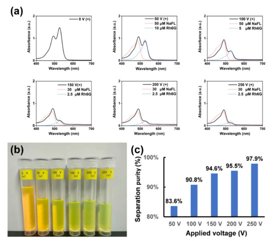Herein, the separation purity was defined as the ratio of the concentration of NaFL solution (CNaFL) to the concentration of the whole solution (CNaFL + CRh6G) in outlet 1 [28,29]. First, absorption spectra of freshly prepared standard solutions of Rh6G and NaFL with different concentrations were experimentally measured (see Figure S2a,b). Then, the calibration curves of the absorbance of Rh6G and NaFL solutions at different concentrations were plotted according to Lambert–Beer’s law based on maximum absorption peaks of Rh6G at 526 nm and NaFL at 488 nm (see Figure S2c,d). Next, the absorption spectra of the solutions collected from outlet 1 under different applied voltages were measured as shown in Figure 4a. By reading out the values of absorbance of the solutions at maximum absorption wavelengths, the concentrations of Rh6G and NaFL of the collected solutions at different applied voltages can be estimated through the calibration curves, respectively (see Table S1). Finally, the estimated separation purity was obtained. For reference, absorption spectra of standard solutions of Rh6G and NaFL with specific concentrations were presented (see Figure 4a). As shown in Figure 4b, the solutions collected from outlet 1 (near the side of the positive electrode channel), with the increase of applied voltages from 0 V to 250 V, the color turned from yellow to green, which reveals a strong voltage dependence of the separation. Figure 4c demonstrate a histogram of estimated separation purities at different applied voltages. When a voltage of 50 V was applied, the separation purity was ~83.6%. Further increase of the applied voltage leads to increased separation purity. Especially when applied voltage was set at 200 V, a separation purity of 95.5% could be obtained due to the enhancement of electrophoretic forces. It should be mentioned that, although the separation performance of 250 V seemed to be a little bit weaker than that of 200 V as shown in Figure 3, the estimated separation purity (97.9%) was higher than that of 200 V.