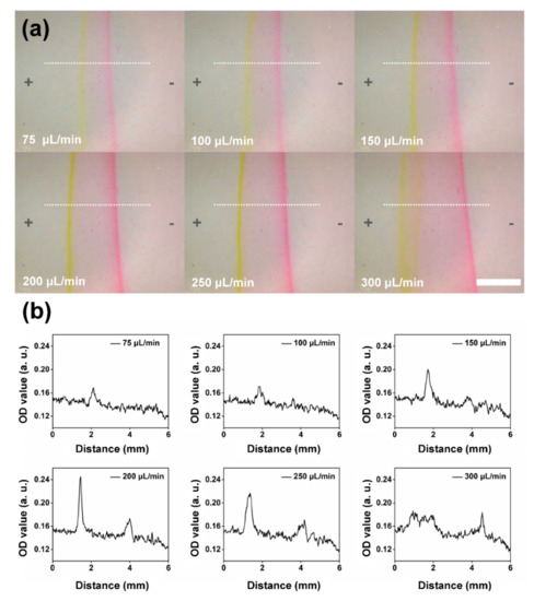 (a) Optical micrographs of the sample solution (the mixture solution of Rh6G and NaFL) in the separation chamber at an applied voltage of 150 V with different flow rates of the sample solutions ranging from 75 μL/min to 300 μL/min. The flow rate of the buffer solution was set at 3 mL/min. The direction of the electric field was from left (+) to right (−). Scale bar: 2.5 mm. (b) Optical density (O.D.) value versus the horizontal distance along the separation chamber estimated from the dashed line in (a) with different flow rates of the sample solutions.