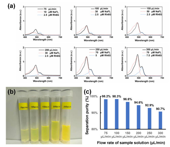 (a) Absorption spectra (solid curves) of the products collected from outlet 1 (near the positive electrode) with different flow rates of the sample solutions ranging from 75 μL/min to 300 μL/min. Blue and red dashed curves are absorption spectra of the Rh6G solution and the NaFL solution with different concentrations for reference, respectively. (b) Photo of the products collected from outlet 1 (near the positive electrode) with different flow rates of the sample solutions. (c) Estimated separation purity versus flow rate of the sample solution.