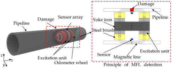 As shown in Figure 1, the axial direction of the pipeline is the x-axis, the circumferential direction is the y-axis, and the radial direction is the z-axis. During MFL detection, the detection system advances along the axial direction. The detection probe is located at the center of the two magnetic poles with slight lift-off.