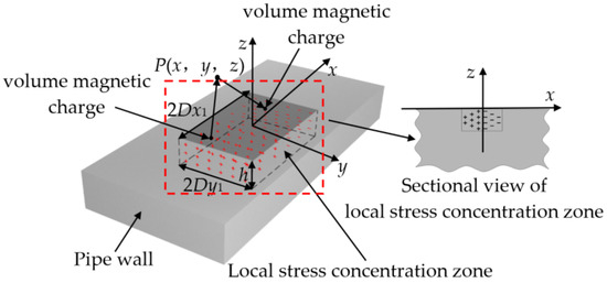 In the actual pipeline stress detection, the stress distribution in the pipeline local stress concentration zone is a function of continuous change. This continuous change causes the magnetic charge to accumulate inside the pipeline local stress concentration zone, and the volume magnetic charge density [30] can be expressed as