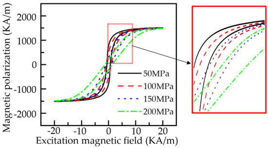 Figure 5 shows that with the increase in the stress intensity, the shape of the hysteresis loop of the pipeline changes, and the magnetization of the material tends to decrease. With the increase in the magnetic field intensity, the difference of the magnetization of the hysteresis loop under different stresses decreases, and the stress has the most significant effect on the magnetization of the material at about 5 KA/m. The results are consistent with the results of the Battle experiment and engineering application [8]. In practical production applications, due to uneven doping, the magnetic mechanical characteristic parameters of the pipeline materials are different, and the hysteresis loops of different materials are slightly offset [32].
