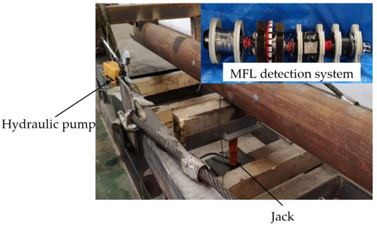 The experimental material is the Q235 pipeline with a length of 6000 mm, a diameter of 273 mm, and a wall thickness of 7 mm. Both ends of the pipeline are fixed with iron frames. The central position below the pipeline is used to simulate the external load using a jack to apply external force. To avoid the impact of the jack material (steel) on the test results, wood blocks (the axial dimension of the pipe is 20 mm, the radial dimension is 50 mm, and the circumferential dimension is 600 mm) are used to isolate the jack from the pipe. The MFL detector of the pipeline is pulled uniformly from the right side of the pipeline to the left side of the pipeline by a hoist, and the three-axis data of the MFL field of the pipe wall are collected. The internal detection experiment of the pipeline MFL under external load is shown in Figure 11.