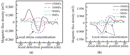 Distribution of the MFL signal of the pipeline local stress concentration zone under different stresses: (a) axial component; (b) radial component.