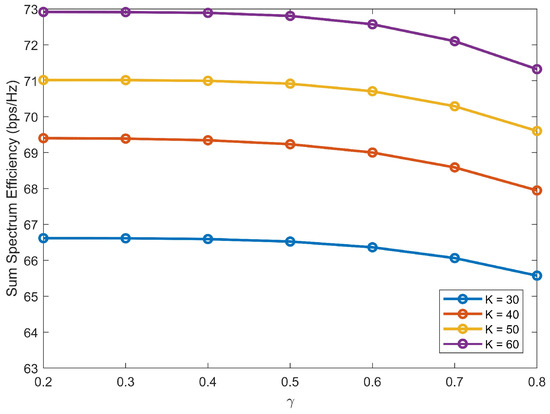 Next, the impact of the decay parameter is further considered. In Algorithm 1, determines the correlation between users’ channel gains and transmitting power. As increases, weak users have made notable gains at the expense of strong users. However, the achievable SE mainly depends on strong users due to their high channel gains. Figure 3 plots SE versus with S = 2 and M = 2. From Figure 3, SE decreases with the increase of due to the performances degradation of strong users.