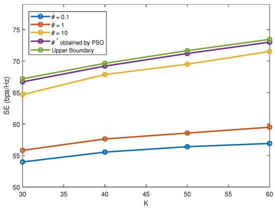 In Algorithm 2, channel differences and correlations are both involved in the design of user clustering. A relative weight is introduced for the two aspects, which is obtained based on group hunting strategy. As discussed before, is of great significance in steering the ultimate clustering scheme. With M = 2, = 0.2 and S = 2, Figure 4 plots SE versus K under different . When = 0.1, the achievable SE is relatively small because of neglect of channel difference characteristics. As increases, we can achieve a better balance between the two contributing factors and SE will increase accordingly. However, when increases to a certain degree, e.g., , the achievable SE will further decrease for overlooking channel correlations characteristics. Moreover, the performance upper bound is also considered. Exhaustive user search can be done to find the optimal clustering scheme. Based on Algorithms 1 and 4, beam-forming and power allocation can be done for each possible clustering scheme to compare their performance. From Figure 4, the performance of the proposed scheme can approach to the upper bound due to the optimization strategy of PSO.