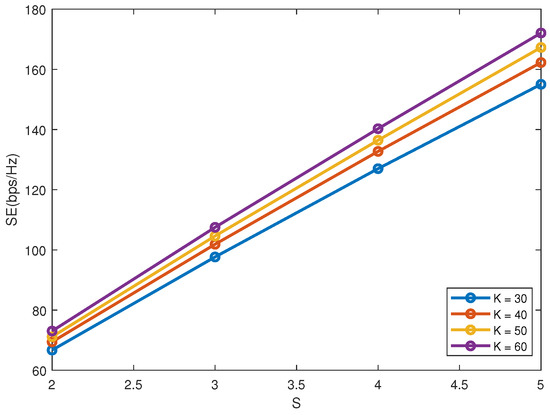 Figure 5 plots SE versus S with M = 2 and = 0.2. The number of users that can be served simultaneously will increase with the increase of S. Moreover, when , there is no interference among different clusters. As shown in Figure 5, SE has a nearly linear increase with S due to the orthogonality among different clusters.