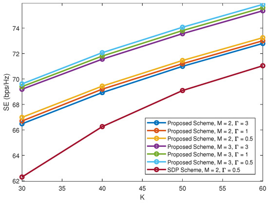 The effect of is also considered. In the SIC-based decoding process, the received SINR at users will increase with the increase of , which not only improves system reliability, but also enables more power budget for edge users. Accordingly, as increases, there is a corresponding increase in edge users’ data rates. With = 0.2, Figure 6 plots SE versus K under different . From Figure 6, the achievable SE is almost unaffected by , i.e., as increases, we sacrifice strong users’ data rates in exchange for weak users’ rates to ensure all multiplexed users can achieve satisfactory performances. However, the existing schemes fail to obtain a feasible solution when is greater than 0.5. By contrast, the proposed scheme is more robust which can obtain a feasible solution with a larger . One explanation for this is that, the proposed scheme solves beam-forming and power allocation separately, which predigests the scope of the considered problem and helps to achieve a better performance with strong robustness.