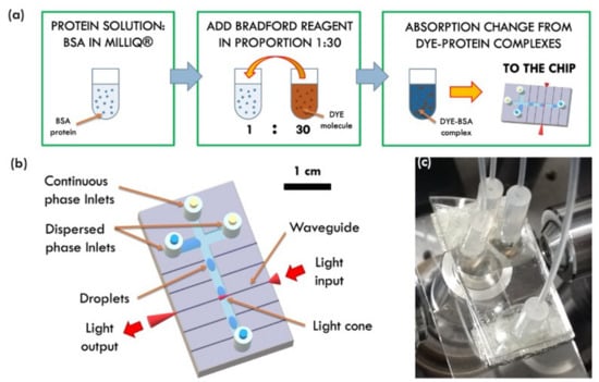Different protein concentrations have been prepared in the range 0.14−1.4 mg/mL and compared to the baseline (0 mg/mL, i.e., zero protein reference). The protein used in this work is the Bovine Serum Albumine (BSA, supplier Merck KGaA, Frankfurter Straße 25064293 Darmstadt, Germany), a typical standard protein in biological research. The Bradford reagent (Bio-Rad) was added to the protein solution in Milli-Q water and in concentration 30:1, as reported in the protocol provided by the supplier. The protein solutions have been measured by standard spectrophotometer technique as reference [6,12,33] by using a spectrophotometer (V-670 UV-VIS by Jasco Europe, Cremella, Italy) in order to measure their optical absorbance as a function of the wavelength and then analyzed by the opto-microfluidic device. A sketch of the reaction system is depicted in Figure 1a.