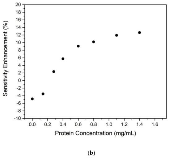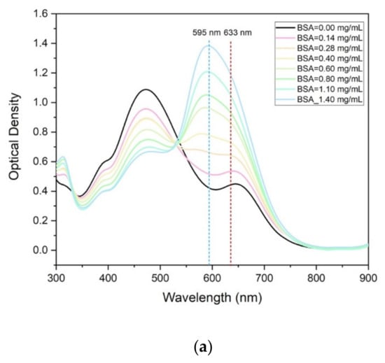 The optical spectra collected at the spectrophotometer are reported in Figure 2a for various protein concentrations in the range 0–1.4 mg/mL compared to the sensitivity enhancement (SE) estimated as (1–OD633nm/OD595nm) in the function of the protein mass concentration (Figure 2b). In particular, OD633nm/OD595nm is the Optical Density (OD) when measured at the peak 633 nm with respect to the peak at 595 nm, respectively.