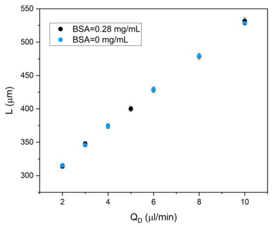 Droplet length as a function of dispersed phase flux QD at QC = 25 μL/min for concentrations of 0.28 and 0.0 mg/mL, respectively. The droplet length was measured by the camera and imaging processing as described in [34,35,36]. The same trend was observed when plotting the droplet velocity as a function of QD, not shown here.