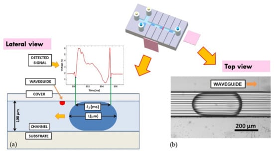 (a) Lateral view of the opto-microfluidic platform when the droplet passes in front of the waveguide. The transmitted intensity (detected signal) is recorded as a function of time: when the droplet passes in front of the waveguide, the transmitted intensity varies accordingly [34,35,36]. (b) Top view: camera picture of the droplet flowing into the microfluidic channel, approaching the optical waveguide (on the right of the picture). The pink squares identify the view planes with respect to the opto-microfluidic platform.