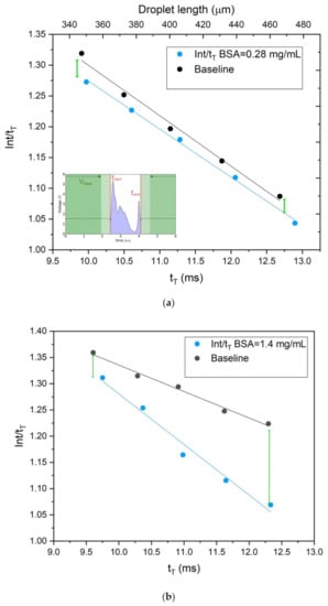In Figure 7, we show Int/tT of the droplet (blue area in the inset of Figure 7a) as a function of tT for two different protein concentrations at a fixed QC value: (a) 0.28 mg/mL and (b) 1.4 mg/mL, respectively. As a matter of fact, Int/tT represents an indicator of the average detected transmissivity of the droplet, whilst the droplet duration tT (i.e., the physical length L of the droplet) can be varied by changing the ratio QD/QC. Calibration curves can be easily built and used for estimating the protein concentration at any QD/QC value within the calibrated range. In particular, Figure 7 shows that the sensitivity given by this detection approach is shape-dependent and that the longer the droplet is, the better the sensitivity. Therefore, at a fixed QC, it is possible to control the sensitivity by tuning the value of QD (and subsequently of tT).