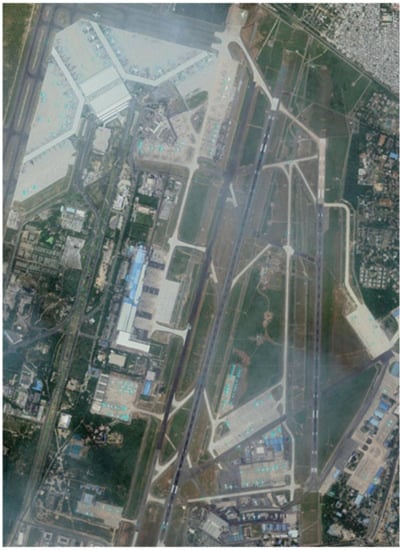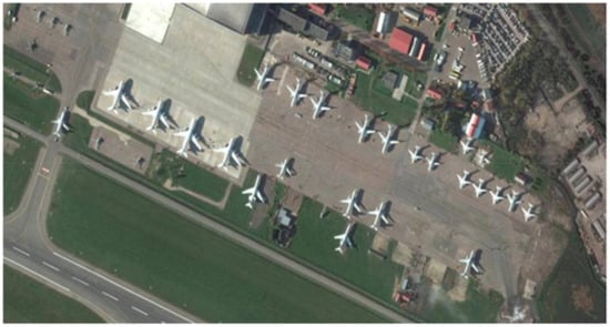 This satellite image is taken by Google Earth. It is an open-source platform for collection of satellite images. This image contains objects of interest, i.e., airplanes.