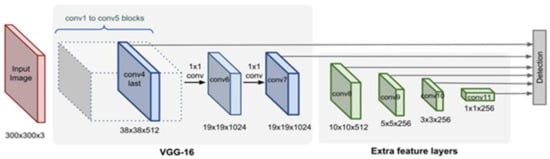 SSD (single shot detector) [55] is based on feed-forward CNN and produces a fixed size of bounding boxes and scores through non-maximum suppression techniques for the presence of objects in those boxes. They use simple CNN for classification, named base network, and add convolutional features layers at the end of base network. They use VGG-16 for the base network. These layers help predictions of object detection at multiple scales and decrease in size progressively (Figure 6). Each feature layer produces different detections and different according to the convolutional model. With the usage of convolutional filters, each layer produces a fixed set of predictions. The predicting parameter of detection 3 × 3 × p (kernel) used for feature layer m × n produces score value and four coordinates of object location. At each location, output values are calculated to a default box location to each feature map position. For each box, SSD calculates a class with four offset values relative to the original box (Figure 6).