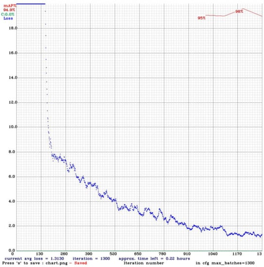 where and are the object’s center coordinates, and w and h are the object’s width and height, respectively, with relation to the picture and name of the object class. YOLT’s input dimension is 416 × 416 × 3 for training, but keep in mind that the image size should not be too huge or the important information will be lost. The dataset is passed through learning algorithms and the weights are saved during batch training. The batch size denotes the number of training samples in a single forward pass. The learning rate is utilized to optimize and minimize the neural network’s loss function, which translates the values of variables onto real numbers while simultaneously displaying the associated cost with those values. For training, we specified a maximum batch size of 5000. Momentum is a technique for increasing training speed and precision. This network was tested on eight object classes on a tensor of 26 × 11. Network consists of 26 × 26 grids. For training, we utilized batch size = 64 and filter = 40.