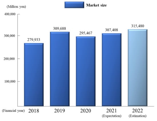 In recent years, owing to the global outbreak of a new coronavirus and to aid the prevention of the spread of infection, entertainment activities such as visiting restaurants, theme parks, and traveling overseas have been greatly restricted, and their vitality is lost. Meanwhile, outdoor activities, which involve less human interaction and a lower risk of infection, have become more popular among both young and old people, made accessible by the outdoor activity boom, which occurred prior to the coronavirus outbreak, and technological improvements in equipment [1] (Figure 1: Trends and forecasts of domestic outdoor equipment, facilities, and rental markets [2]). Mountaineering, in particular, has gained popularity as a leisure activity that can be enjoyed easily by anyone because of the ease of access to well-maintained mountain trails, the improvement in the quality of mountain lodge accommodation, and the lightening of mountain equipment.