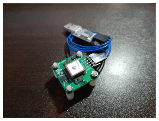 The GPS logger used in this study was a GPS receiver kit (Akizuki Denshi Tsusho Co., Ltd., Tokyo, Japan) [16] (Figure 4), which uses GYSFDMAXB (TAIYO YUDEN CO., LTD., Tokyo, Japan) [17] as the GPS module. The receiver is compatible with three Japanese Quasi-Zenith Satellite Systems (QZSS): “MICHIBIKI” (satellite numbers 193 (MICHIBIKI first), 194 (MICHIBIKI second), and 195 (MICHIBIKI fourth)). Reception accuracy was improved for use in Japan. The receiving frequency is 1575.42 (MHz, L1, C/A code) and the modulation method is BPSK. The National Marine Electronics Association 0183 (NMEA) sentences used in this study were the GPGGA. Therefore, latitude, longitude, time, and altitude were obtained by serial communication using this module.