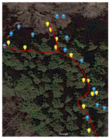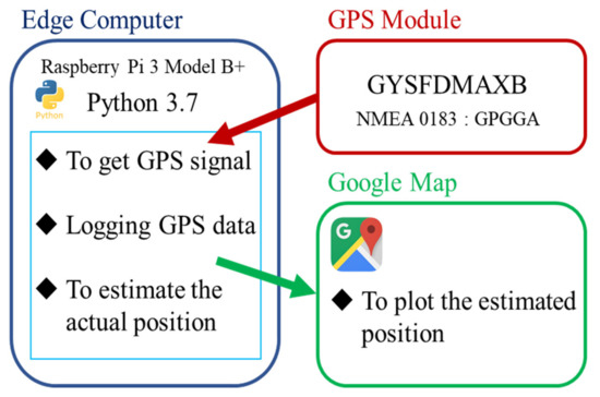 In this study, we first examined and discussed the results, accuracy, and sources of error when using only GPS location information and actual measurements with the device. The plotted location information was updated and stored every 10 s, and all information was acquired while walking. In the system, the signals sent from the GPS module to the edge computer are truncated to two decimal places, so there is always an error compared to the actual received signals. Therefore, all errors within a radius of 5 m were assumed to be negligible.