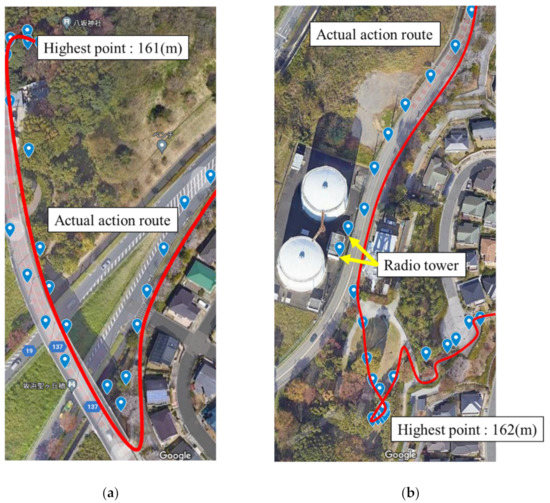 Next, we recorded a route at a relatively high altitude with good visibility. The distance traveled was approximately 3.5 km, and the altitude was measured as between 40 m and 166 m. Here, we obtained location information with a very high accuracy (Figure 7a). We were able to receive position information with a maximum error of 10 m for all data. However, the accuracy of the location information deteriorated significantly near a mobile phone base station and a disaster prevention radio base station, which were located near the highest elevation point, owing to interference and an increase in noise floor level (Figure 7b). Table 2 illustrates the numerical data of the error with the respective latitude/longitude information.