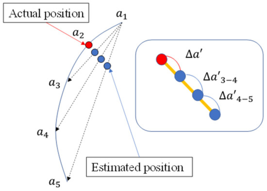 Therefore, in this study, we propose a new method for estimating the past location based on previous information, using the location information of up to five points. Let the point to be predicted be . The estimated position, , is calculated by the difference of each point to using Equation (1). Then, the distance between each of the estimated positions is calculated and the average is deduced. This value is then added to to obtain the predicted position . This is illustrated in Equation (2) and Figure 8.