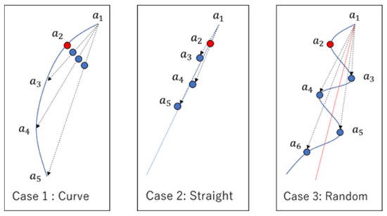 When Equation (2) is used, the estimated value can be classified into three patterns (Figure 9). In Case 1 (a curve) and Case 2 (a straight line), the difference can be calculated appropriately, so the method is effective. However, it is difficult to estimate the position of randomly scattered GPS locations, as in Case 3. However, Case 3 can be disregarded because it is unlikely that the user would be walking along a mountain path that meanders every 10 s and that the GPS would receive the information properly.