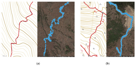 The comparison of log of the actual route of Mt. Kentoku. (a) The actual route and the GPS-recorded route in the mountainous area. (b) The actual route and the GPS-recorded route in the open and clear area.