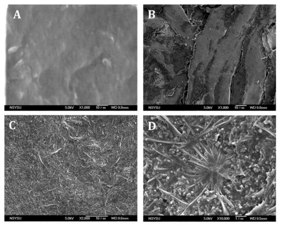 SEM images of (A) pencil graphite rod, (B) Pre-anodized pencil graphite rod, (C,D) Poly(thionine) on the pre-anodized pencil graphite rod with different magnifications.