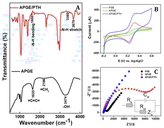(A) FT-IR spectra of the APGE and APGE/PTH, (B) electrochemical CV response of different electrodes in 5 mmol/L of K3/4[Fe(CN)6] in 0.1 M KCl with scan rate of 50 mV/s and (C) EIS response of the different electrodes in 5 mmol/L of K3/4[Fe(CN)6] in 0.1 M KCl at Eapp is 0.18 V vs. Ag/AgCl (inset figure, Randles equivalent circuit).
