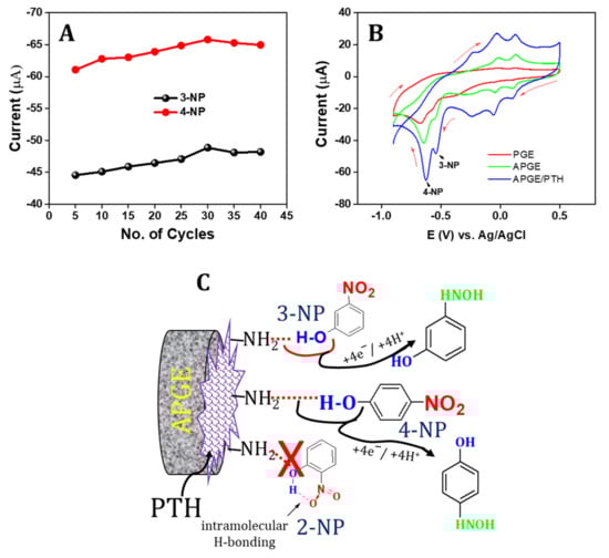 A different series of cyclic voltammograms were studied for the optimization of poly(thionine) formation on the APGE surface. The poly(thionine) thickness was directly connected with the number of sweeping segments throughout the electrochemical polymerization [39]. The poly(thionine) film thickness was thus studied by numerous polymerization cycles on the sensing of 3-NP and 4-NP. The PTH was prepared via the electrochemical polymerization technique on the pre-anodized graphite electrode in 0.1 M PBS in 0.5 mmol/L of thionine and a cycling range from 5 to 40 with a scan rate of 50 mV/s. Figure 3A shows the different forms of electrocatalytic behavior of PTH with a different number of sweeping cycles. The redox peak and cathodic current were increased after increasing the number of sweeping segments up to 30 cycles. After 30 cycles, the cathodic peak current decreased slightly. This behavior demonstrates the activity of PTH at certain thickness levels and electron transfer of the polymer thickness barrier [58]. Hence, 30 sweeping cycles was chosen as the optimum condition for the electrocatalytic sensing of 3-NP and 4-NP.
