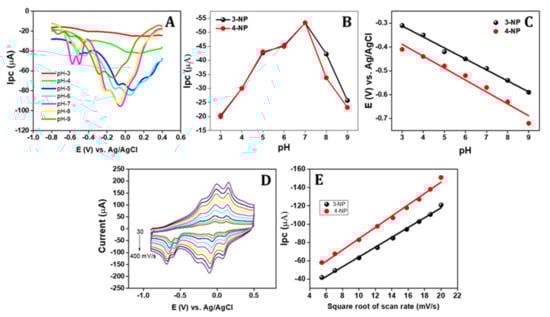 (A) Influence of different pH condition (pH-3 to pH-9) on sensing (20 µM) of 3-NP and 4-NP; (B) the relationship between pH vs. cathodic peak current of both 3-NP and 4-NP; (C) the relationship between pH vs. cathodic potential shift of both 3-NP and 4-NP; (D) the influence of different scan rates (30 to 400 mV/s) in the presence of 20 µM of 3-NP and 4-NP in 0.1 M PBS; and (E) the relationship between the square root of scan rate vs. cathodic peak current of 3-NP and 4-NP.